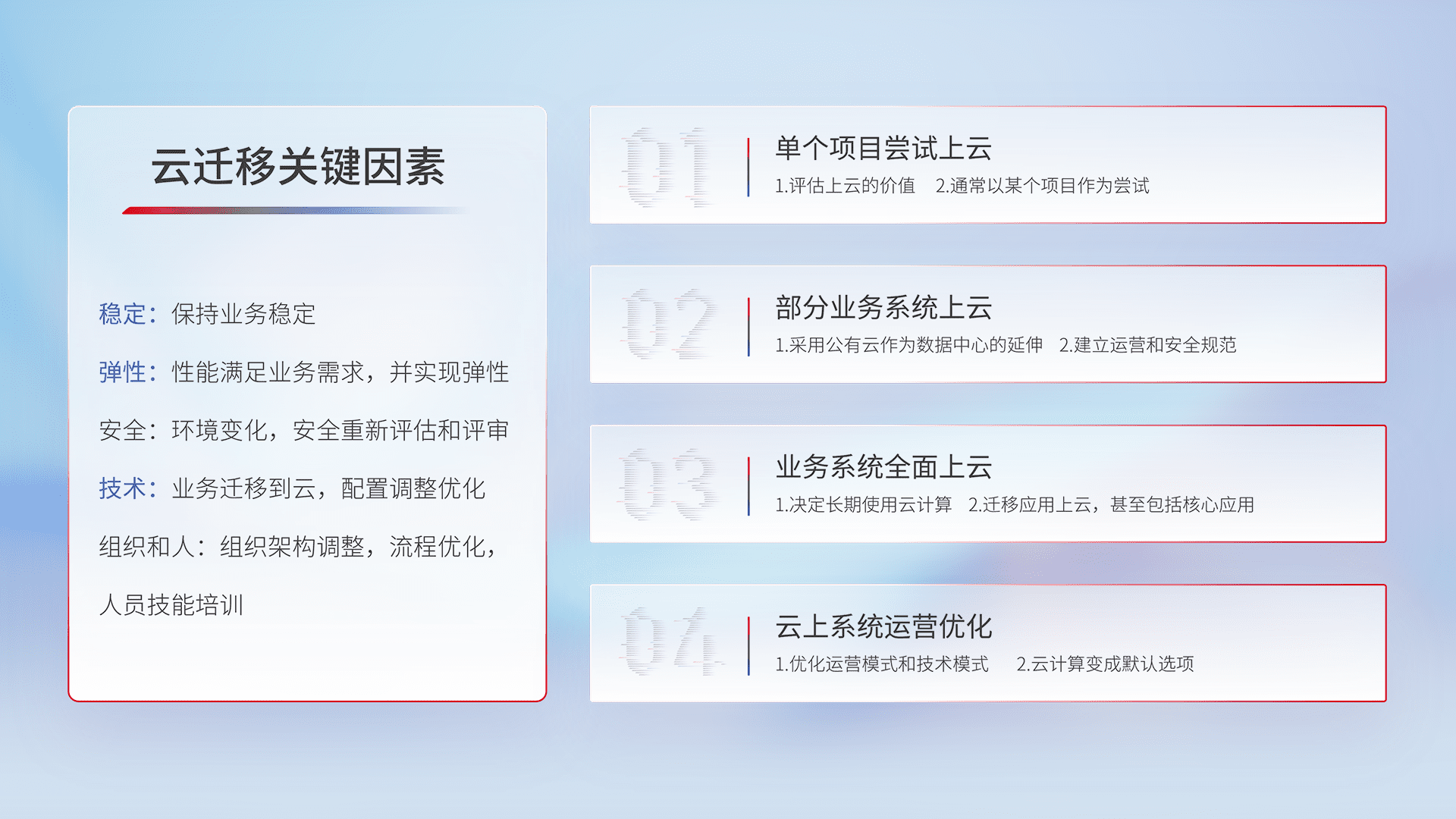 结合实际业务,,,,从规划设计、、、云平台选型、、云原生改造、、、、数据迁移、、集成交付,,,迁移全过程为客户识别最佳上云路径,,,,做好风险识别管理,,设计网络架构、、身份权限、、、安全审计合规、、操作审计、、、、日志审计、、监控告警策略、、多站点容灾设计等,,,,对云上基础设施进行整体规划,,,,提升IT治理水平,,以满足弹性、、、高可用、、高性能的需求。。。