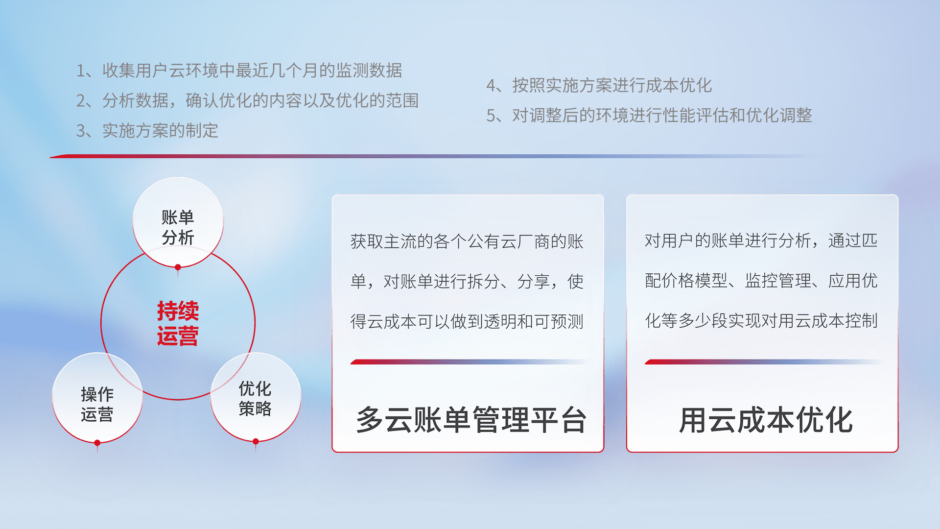 通过多云纳管,,,,以统一的资源数据模型把客户的云资源进行抽象和封装,,进而实现对多云资源的统一操作,,,保障云资源管理的可靠性、、、稳定性与可用性。。量身定制化运维内容,,,,配置、、开发运维、、补丁管理、、、、备份、、、、监控、、、认证和访问管理、、、审计和日常巡检等,,,保障在用云过程中的可靠度,,稳定度以及高可用率。。。。